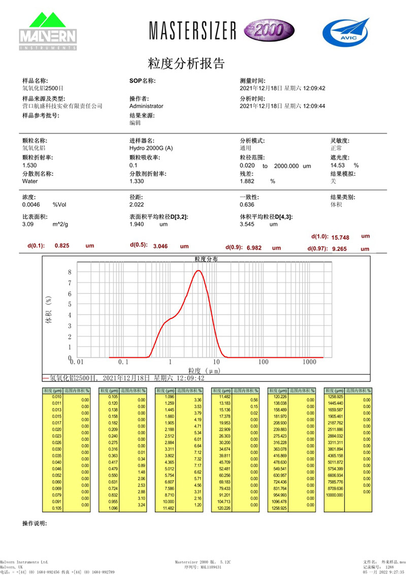 氫氧化鋁2500目馬爾文典型粒度分析圖: